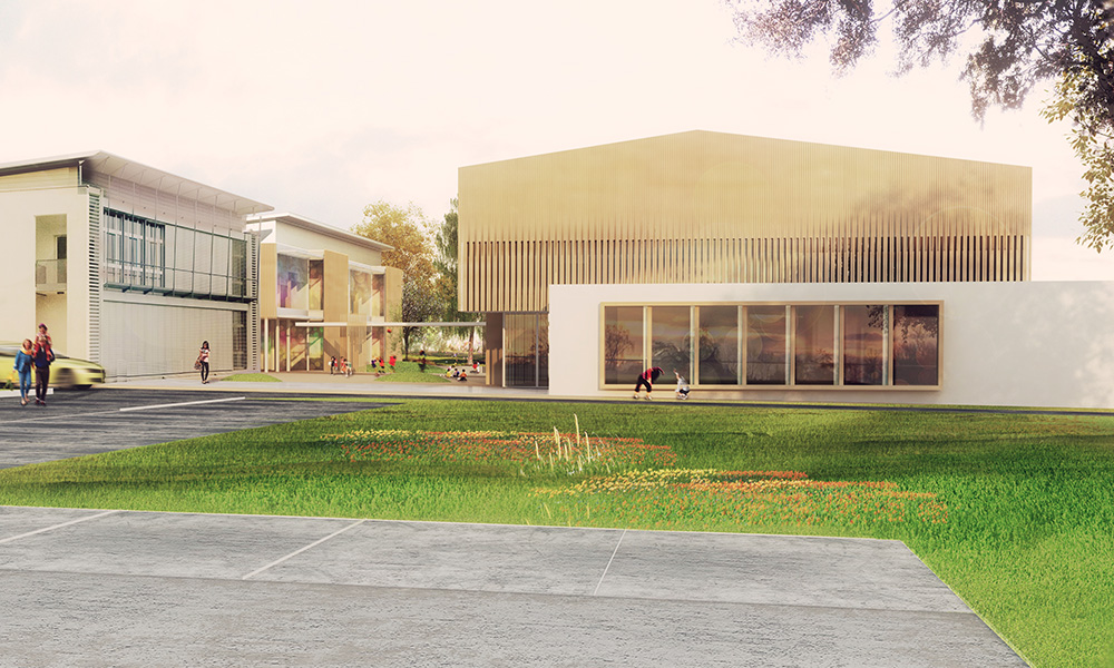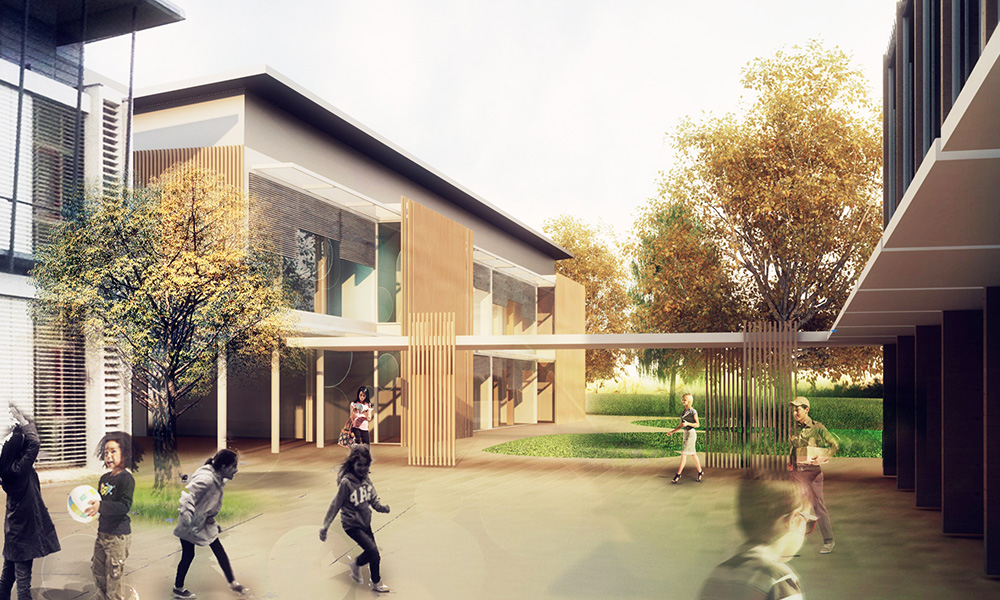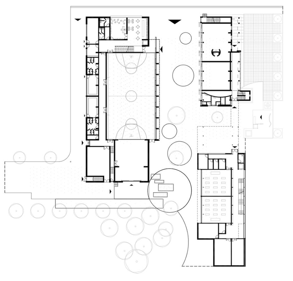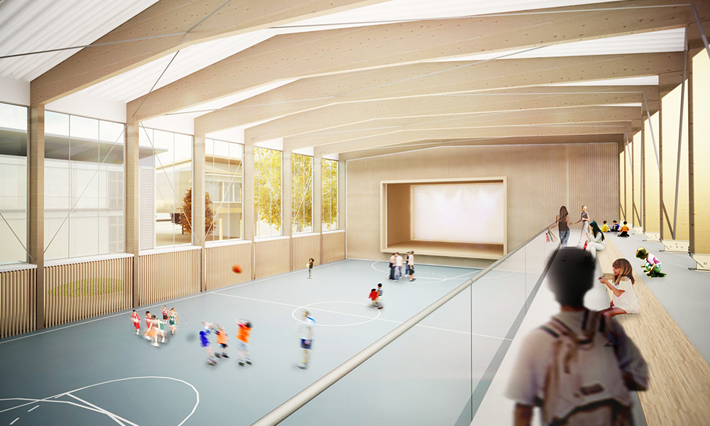 Le projet d’agrandissement s’implante dans le site en s’appuyant sur la composition paysagère et urbaine passée de Gletterens : il identifie un «axe vert» Est-Ouest, parallèle à la rive du lac, comme le prolongement du bois à l’intérieur de la parcelle, puis un «axe minéral» de cheminements Nord-Sud. Les masses bâties du bâtiment existant de l’école, du nouveau bâtiment scolaire dans son prolongement et de la salle polyvalente en face identifient une cour intérieure ouverte, sans frontières, mais qui ne se noie pas pour autant dans l’échelle du territoire.