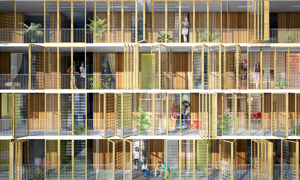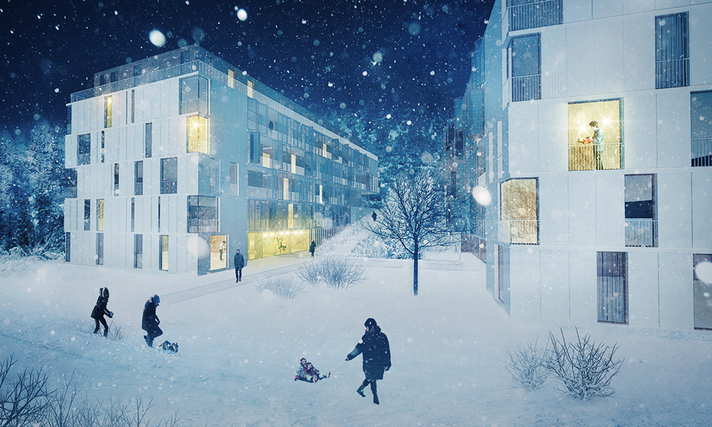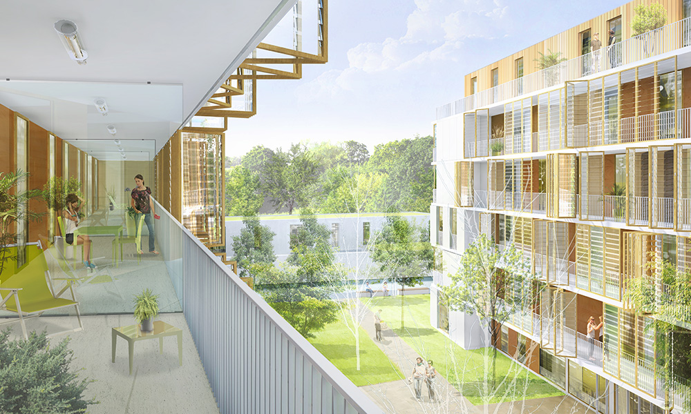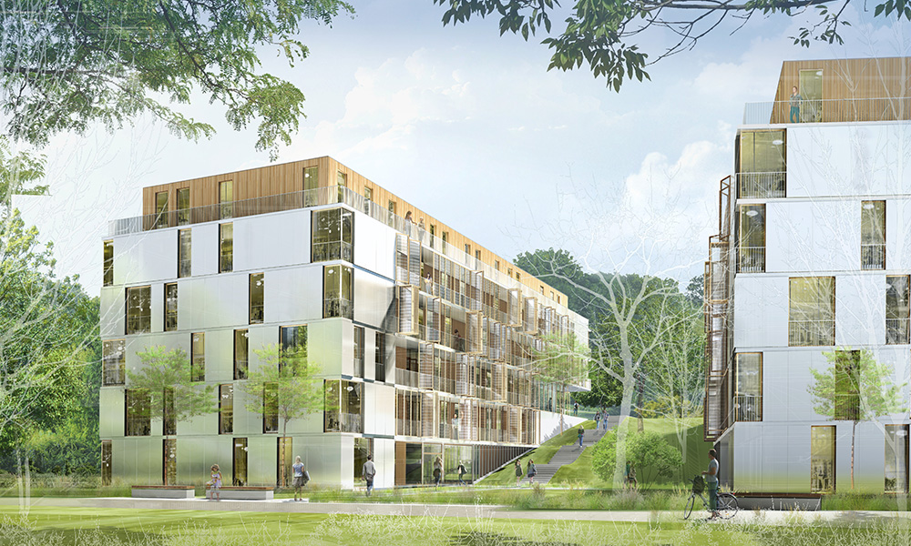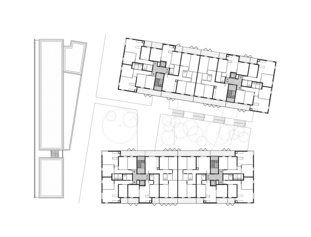 En s’installant dans la profondeur du site, le projet choisi de souligner la connexion paysagère Nord-Sud et de se protéger du bruit provenant de la Route de Berne. Deux entités jumelles de logements et un troisième volume accueillant la crèche et quelques appartements orientent leurs activités vers un coeur d’îlot ouvert, renforçant la possibilité d’une multiplicité d’échanges dans ce lieu. Dans la perspective d’un lieu connecté et équilibré, nous faisons la proposition d’une architecture généreuse et ouverte pouvant contribuer à l’épanouissement des individus et au développement des liens qu’ils tissent entre eux.