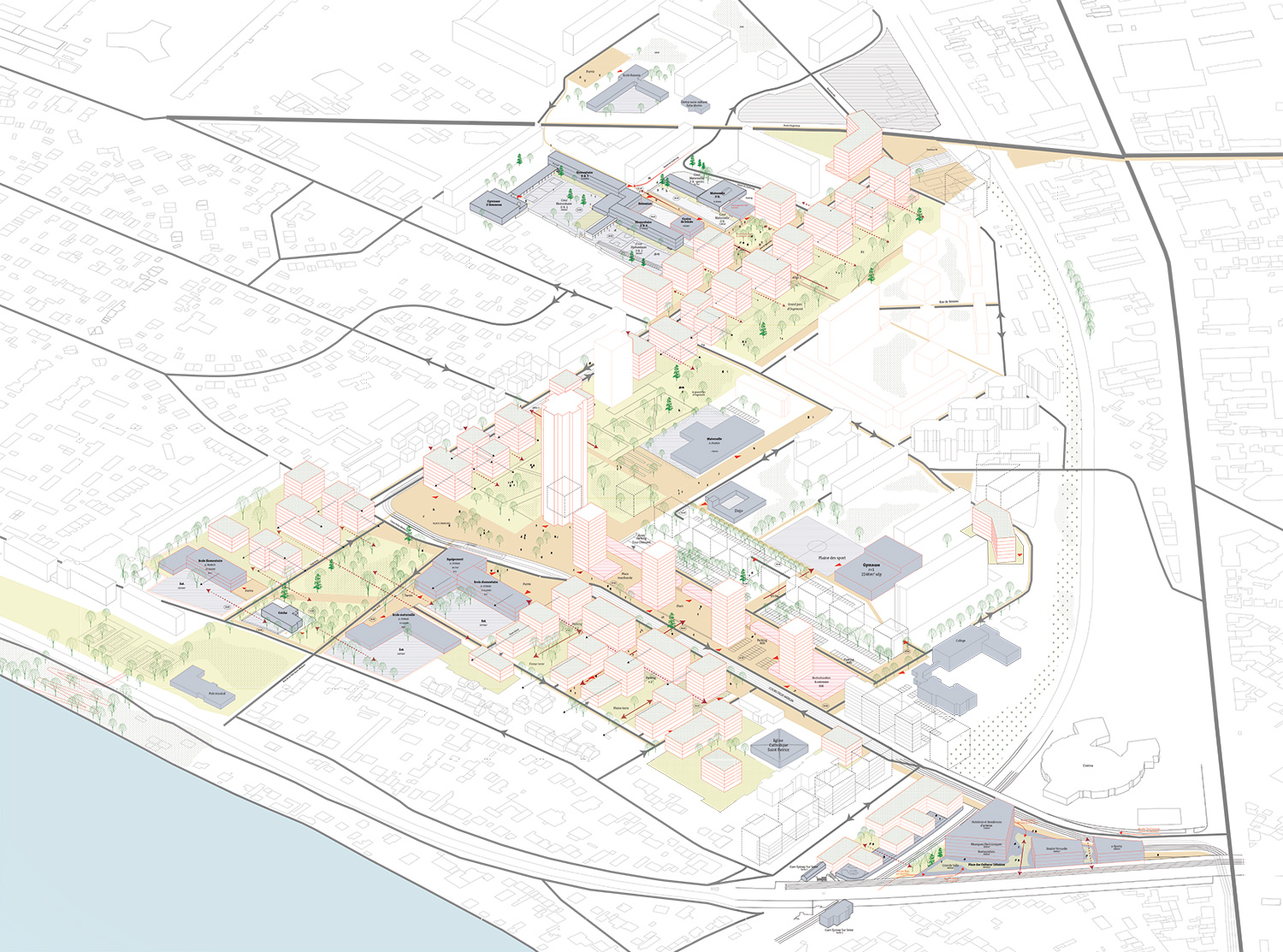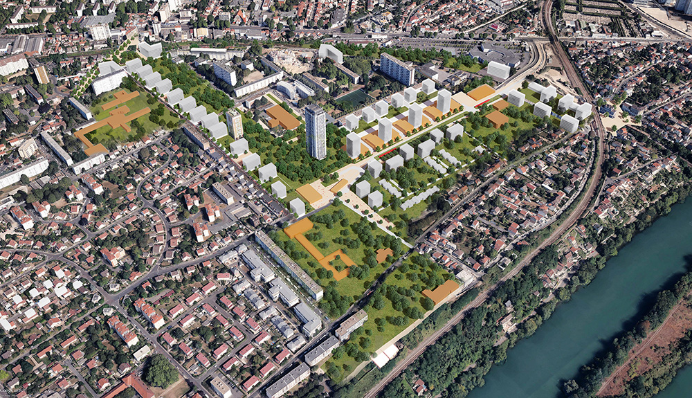 En dépit d’une densité visuelle apparente des masses construites, la densité réelle est très faible puisqu’elle est inférieure à 60 logements à l’hectare. La mutation souhaitée des habitats et du ressenti est donc possible. Mais l’expérience le montre, la mixité sociale demande comme condition la mixité fonctionnelle. Il faut donc s’appuyer sur les pôles existants et les renforcer. La gare, le cinéma, les commerces, les équipements culturels, mais aussi veiller dans leur développement à ne pas reproduire un modèle ancien : la mono-fonctionnalité hier dans les logements, aujourd’hui dans les équipements. Une gare mais pas seulement une gare, un centre commercial et pas seulement, un pôle culturel et pas seulement.