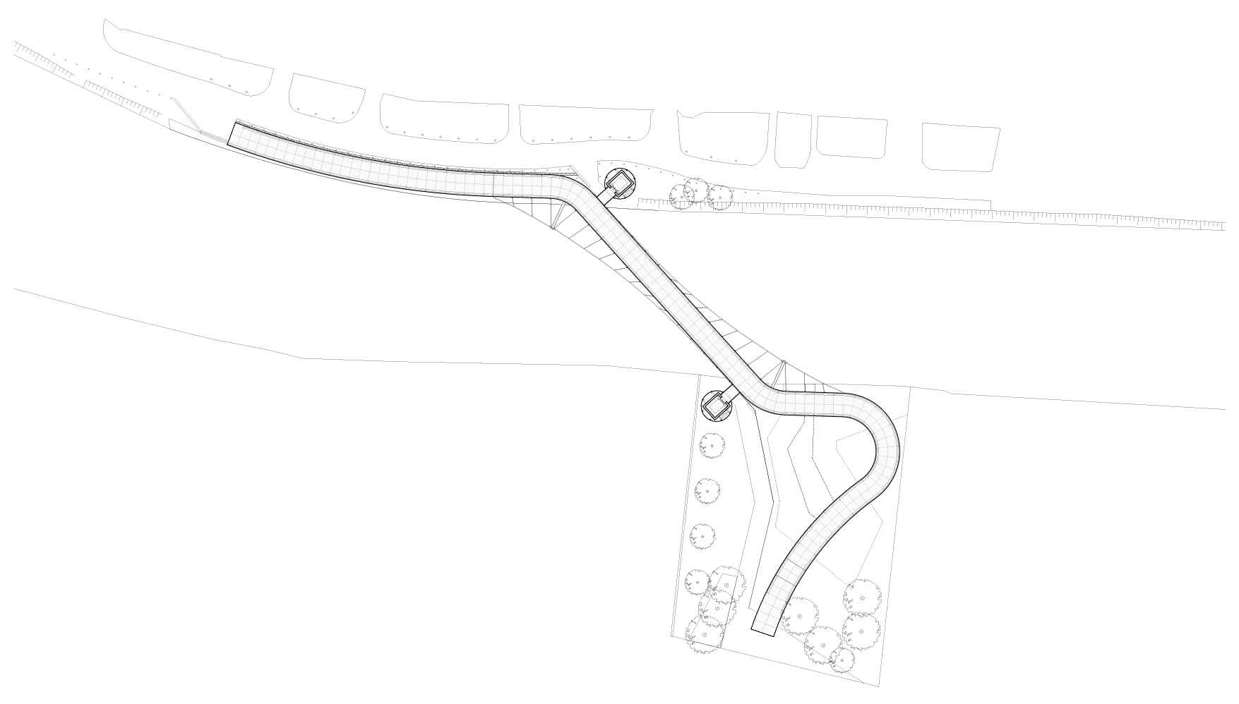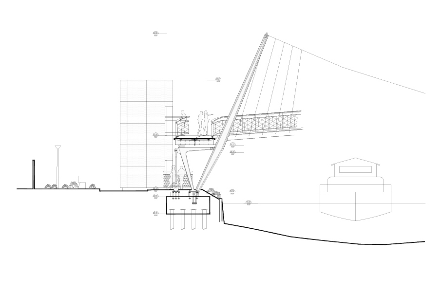 La passerelle enjambe la Somme, sur un développé de 150 m linéaires, et relie le « nouveau quartier » au site naturel des hortillonnages. Le revêtement de l’ensemble de l’ouvrage est réalisé en béton de fibre de teinte claire, et la main courante intègre un éclairage. Les deux gaines ascenseur en béton sont habillées d’un bardage en tôle perforée avec intégration d’un éclairage permettant d’obtenir un effet « lanterne ». La structure est composée d’un caisson mince en acier soutenu par un système haubané et des appuis et mats en profilés reconstitués soudés en acier.