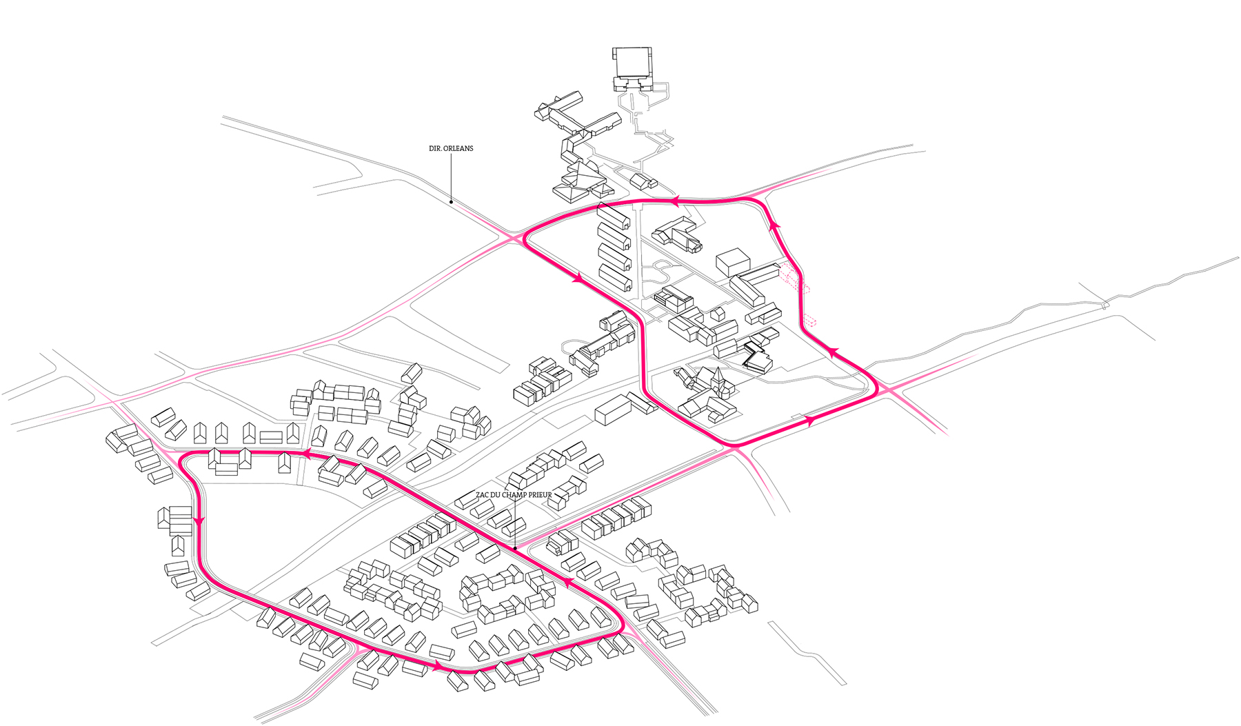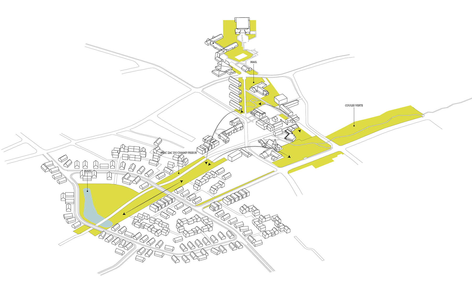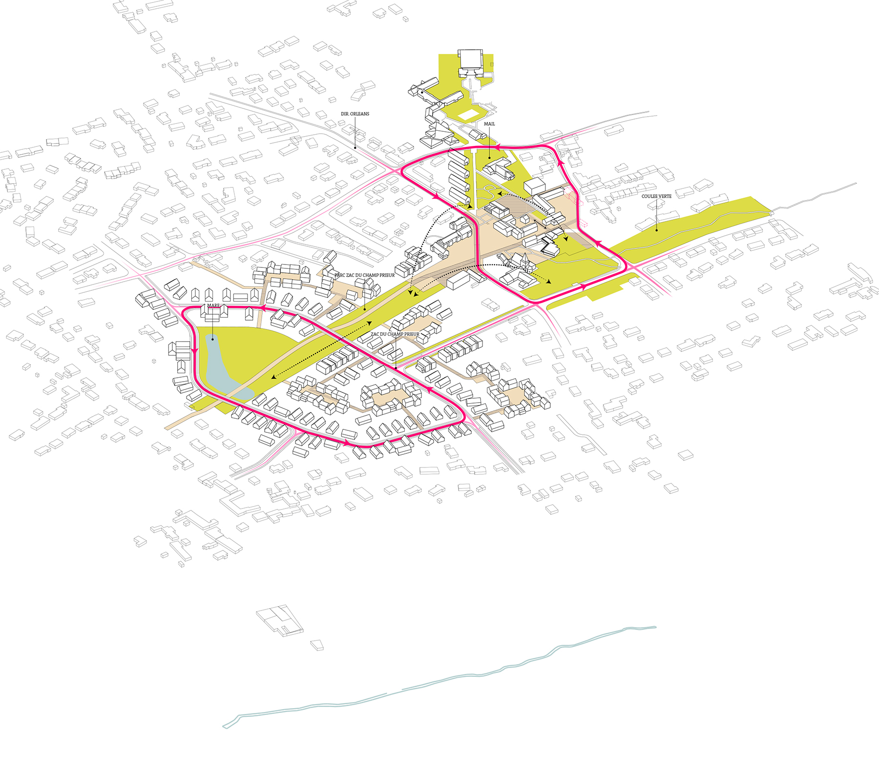 La ZAC du Champ Prieur la ZAC du Champ Prieur se développe en continuité du centre bourg (place François Mitterrand et rue Mendès France) et vient au contact de la zone pavillonnaire existante en affirmant un espace vert central qui accompagne le tracé du chemin de Loire existant. L’habitat individuel vient de temps à autre s’agglomérer en hameaux venant ainsi créer des placettes et des cours générant convivialité et limitant l’étalement urbain. De petits collectifs se placent stratégiquement aux points les plus dynamiques. La diversité de logements et des formes urbaines profiteront à la mixité sociale et générationnelle au sein du futur quartier. Le Parc de la Loire s’imposant au coeur du quartier vient unir le tissu urbain existant et à venir.